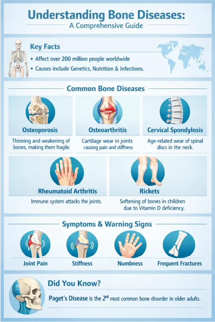 - Bone diseases are common globally, with osteoporosis affecting over 200 million people. Conditions like osteogenesis imperfecta and Paget’s disease are rare but challenging for patients.